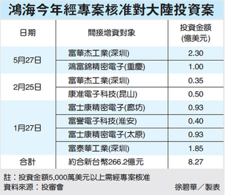 報道說,臺灣首富郭臺銘旗下的鴻海集團今年仍不斷投資大陸,由投審會項目審查核準的案子已有八件,累計金額8.27億美元,約新臺幣266億元。投審會執(zhí)行秘書范良棟指出,鴻海在大陸據點超過100個,增資資金來源來自盈余,大陸事業(yè)獲利后,一部分匯回臺灣,一部分再投資。