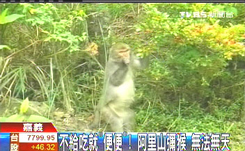 中新網(wǎng)12月21日電 據(jù)臺(tái)灣TVBS報(bào)道,阿里山現(xiàn)在也出現(xiàn)彌猴,猴子為了吃東西,還會(huì)雙手合十拜托民眾給香蕉吃,不過(guò)看到民眾不肯給,猴子居然調(diào)皮的,跳到民眾的車(chē)子上排泄,甚至還會(huì)把山上的花摘來(lái)吃,讓民眾好氣又好笑。
