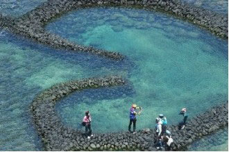 初見“雙心石滬”的游客,總以為這是自然地景,殊不知這精巧的石滬全出自當(dāng)?shù)貪O民之手,能維持如此完美的造型,得靠漁民時時維護修補。就因為“雙心石滬”造型美得像藝術(shù)品,也成為七美島最著名的旅游景點,更期待能近距離接觸。