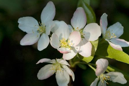 蘋果花花苞外側(cè)為粉紅色,粉嫩粉嫩的,張開的花朵則有些是純潔的白色,有些則還帶有一些些粉紅,好像情竇初開的少女,嬌羞嫵媚。