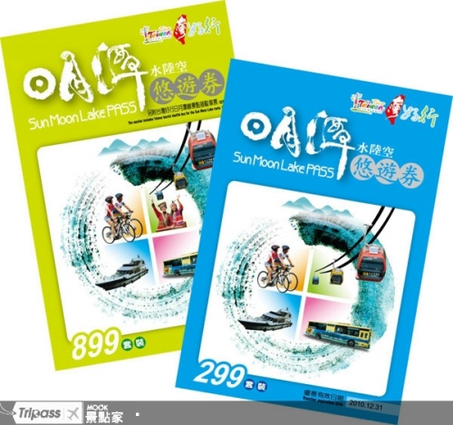 日月潭水陸空悠游券分為299元藍(lán)色套裝6合1優(yōu)惠,包括纜車票、水社到伊達(dá)邵船票(單趟)、環(huán)潭巴士1日票、捷安特單車1小時(shí)免費(fèi)體驗(yàn)券,和電動(dòng)車租車8折券,游客到寺廟蓋紀(jì)念章,還可以兌換日月潭的獨(dú)特紀(jì)念品。若是需要臺(tái)中至日月潭交通接駁的游客,可選擇899元的綠券,除了藍(lán)券優(yōu)惠外,再包含臺(tái)中至日月潭的臺(tái)灣好行景點(diǎn)接駁來回票,以及九族文化村門票。