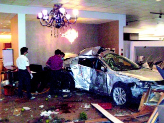 據(jù)臺(tái)灣《聯(lián)合報(bào)》報(bào)道,位于蘭陽(yáng)大橋南端的家具行前晚11時(shí)許還在營(yíng)業(yè),店員正帶客人看家具,突然聽到“吱”一聲尖銳摩擦聲,接著“轟”的一聲,整臺(tái)銀色小轎車側(cè)撞進(jìn)來(lái),迎路整片落地玻璃撞碎,家具被撞飛,霹靂啪啦一片狼藉。