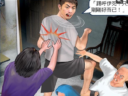 沈父倒在地上不斷哀號,在房內(nèi)睡覺的沈弘隆姑姑趕緊跑出來察看,大喊:“不要打了!”一把將侄子推開說:“當(dāng)兒子的,怎么可以打老爸!钡蚝肼∈ダ硇裕回嗆姑姑說:“踢呼伊死(指沈父)!只是剛剛好而已!”甚至拉開姑姑,再踢了父親一腳,才掉頭逃離現(xiàn)場。