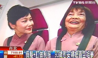 中新網(wǎng)7月29日電 據(jù)臺(tái)灣TVBS報(bào)道,臺(tái)灣最年長慰安婦、93歲高齡的吳秀妹4年前積極投入慰安婦對(duì)日本求償?shù)目棺h活動(dòng)中,多次前往日本、韓國。吳秀妹愛上搭飛機(jī),尤其喜歡看空姐工作,臺(tái)灣婦援會(huì)知道吳秀妹很想當(dāng)空姐,尋求航空公司協(xié)助,終于一圓吳秀妹的空姐夢(mèng)。