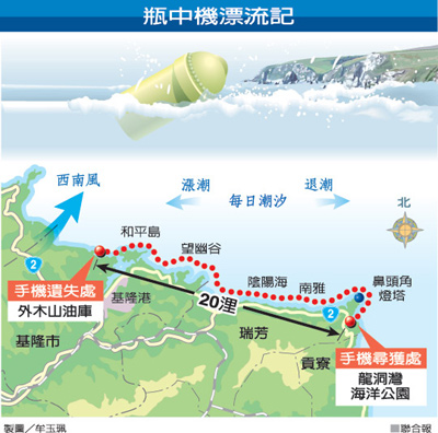 這只“瓶中機”由基隆“流浪”到貢寮,中間穿過基隆港、望海巷、陰陽海、水湳洞等地,最后從鼻頭角漂進龍洞灣海洋公園;流浪了三天多,漂流距離約20浬(34公里)。