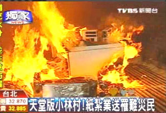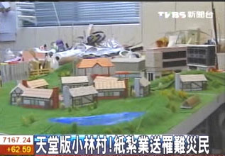 中新網(wǎng)9月4日電 臺灣“八八水災(zāi)”毀了高雄縣小林村,3日正逢中元節(jié),臺北縣有家專門制作“天堂配件”的紙?jiān),為讓死者安息,連夜趕工蓋出“天堂版小林村”,里頭除了住家、學(xué)校以及商店街,希望火化后,能讓不幸的罹難者,在天上有棲身之地。