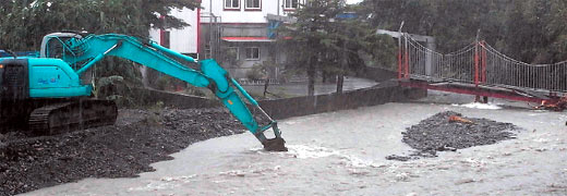 災(zāi)情最嚴(yán)重的是冬山鄉(xiāng)的太和村,上游的十三份溪在上次芭瑪臺(tái)風(fēng)來襲時(shí),溪里大量土石淤積,還來不及全部清除,這次又逢大雨,溪水暴漲淹到路面,多條農(nóng)路封閉?h府工務(wù)處緊急出動(dòng)3臺(tái)挖土機(jī)疏浚十三份溪,避免溪水的水位持續(xù)升高,造成更嚴(yán)重的災(zāi)情。