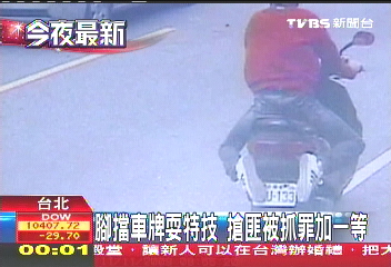 據(jù)臺灣TVBS電視臺報(bào)道,日前,臺北縣土城的街上出現(xiàn)一名男子,騎摩托車時(shí)用很奇怪的姿勢,把兩只腳彎到車后遮住車牌。其實(shí)這名男子是飛車搶劫的嫌犯,為躲避警方查緝,異想天開地用詭異的姿勢騎車,警方仔細(xì)分析車牌,還有嫌犯的犯案型態(tài),最后還是抓到了這名“自我感覺不會落網(wǎng)”的笨賊。