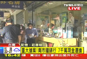中新網11月23日電 據臺灣TVBS報道,臺南市一家鐘表行老板,23日下午到銀行提領新臺幣7000萬元現(xiàn)金,準備買黃金用,沒想到回家途中遭歹徒尾隨,回到店內時歹徒開槍搶走現(xiàn)金,流彈還意外波及在店內的老板侄女,侄女小腿中彈,送往成大醫(yī)院急救,歹徒則逃逸無蹤。