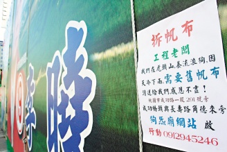桃園市區(qū)大型選舉廣告牌下端,連日被貼了索取告示:“拆帆布老板,我們在虎頭山飼養(yǎng)流浪犬,因為天氣寒冷,如果舊帆布不再需要,請送給我們,感恩不盡……”