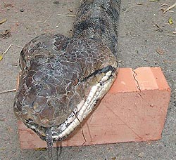 消防隊(duì)員手到擒來(lái)的是一只球蟒,體型粗壯,孔武有力,因?yàn)椴皇桥_(tái)灣原生種,分析應(yīng)該是民眾豢養(yǎng)的寵物,任意放生,結(jié)果四處嚇人。
