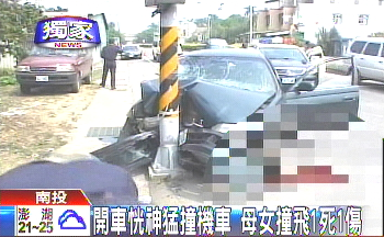中新網(wǎng)3月4日電 據(jù)臺(tái)灣TVBS報(bào)道,南投縣草屯今天發(fā)生一起死亡車(chē)禍,轎車(chē)駕駛疑似恍神,直接撞上騎摩托車(chē)雙載的母女,車(chē)被撞飛了10米遠(yuǎn),坐在后座的媽媽雖然有戴安全帽,但因?yàn)樗は萝?chē)時(shí),被轎車(chē)撞上頭部,當(dāng)場(chǎng)傷重不治。