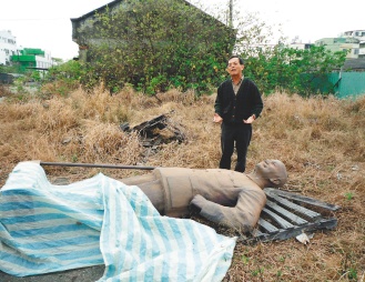 鳳山火車站前的蔣介石銅像漏夜被拆下,棄置車站附近雜草地,當(dāng)?shù)夭芄镩L翁國忠攤開雙手,表示無奈。圖片來源:聯(lián)合報(bào)