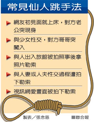 中新網(wǎng)3月17日電 據(jù)臺灣《聯(lián)合報(bào)》報(bào)道,“要不要一起賺大錢?”16歲的陳姓援交女上網(wǎng)發(fā)現(xiàn),男子徐德欽、謝丁玄征求仙人跳女主角,認(rèn)為比援交好賺而加入;從去年6月起,這伙人以援交方式設(shè)局仙人跳至少6次,詐財(cái)上百萬元(新臺幣,下同)。