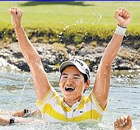 中新網(wǎng)4月6日電 據(jù)臺灣媒體報道,臺灣高球天后曾雅妮5日在LPGA(Ladies Professional Golf Association,女子職業(yè)高爾夫巡回賽)四大賽之一、納比斯科錦標賽中擊敗世界前10名高手,奪下后冠,獲得30萬美元獎金,也是賽史上第1位摘冠的華人球員。曾雅妮奪冠后激動得舉起雙手,興高采烈地依照傳統(tǒng)躍進水池中慶祝。