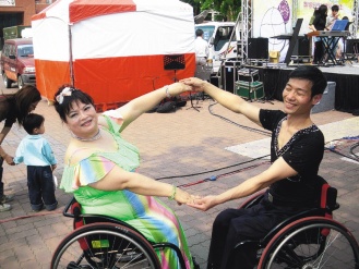 3年前梁春錦罹患乳癌,手術(shù)后以運(yùn)動(dòng)抗癌,她游泳、跳輪椅國(guó)標(biāo)舞及練瑜珈。蘇俊源為陪伴妻子,也一起練習(xí),兩人成為舞伴,也加入志工,經(jīng)常參加活動(dòng),夫妻倆坐著輪椅跳國(guó)標(biāo)舞,鼓勵(lì)了許多殘障者。