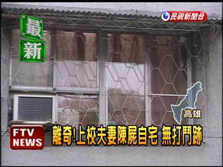 中新網(wǎng)4月19日電 據(jù)臺灣民視新聞報道,高雄縣鳳山工協(xié)新村18日驚傳一對夫婦陳尸住處的離奇命案,死者是60幾歲,上校退伍的曾清賢,與妻子雙雙陳尸在客廳跟臥房,警方說,由于現(xiàn)場沒有打斗的痕跡,門窗也沒有被破壞,將等檢察官進一步驗尸,確認死因。
