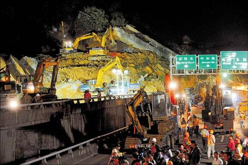 由于土石量太大,總重超過20萬噸,臺灣“高速公路局長”曾大仁表示,將全面搶修,希望兩周內清理完土石,搶通可能需20日以上;不過軍方搶救人員昨晚接到軍方高層最新指令,要求一周內全力搶通。