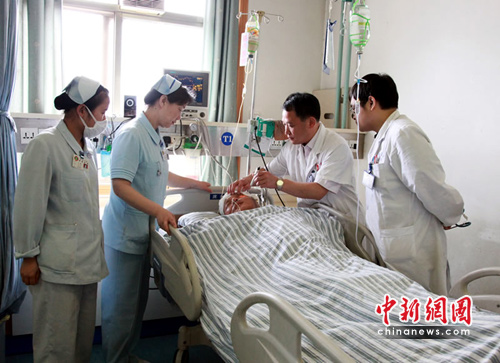 中新網(wǎng)長沙5月6日電(劉柱 伍西明)“多虧醫(yī)院救了我丈夫的命,歡迎你們來臺灣做客!”在湖南湘雅醫(yī)院重癥醫(yī)學(xué)科(ICU病房),剛剛從臺灣趕來長沙的臺胞患者梁登輝的夫人對病房里的醫(yī)生和護士們連聲感謝。