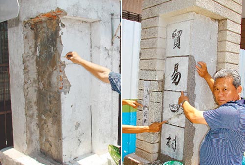 中新網(wǎng)5月20日電 據(jù)臺(tái)灣《聯(lián)合報(bào)》報(bào)道,臺(tái)南縣仁德鄉(xiāng)二空眷村將拆除改建大樓,包商日前把村門口由宋美齡落款題字“貿(mào)易四村”的石柱拆除,遭眷戶抗議并報(bào)警,指軍方與包商竊盜眷村文物。包商昨天把落款貼回,但損裂痕清楚可見。