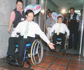 中新網(wǎng)6月3日電 據(jù)臺(tái)灣《聯(lián)合報(bào)》報(bào)道,臺(tái)北2010友善建筑(無(wú)障礙建筑)評(píng)選活動(dòng),2日選在獲得首屆“友善建筑”的臺(tái)北市府1樓ENJOY餐廳開(kāi)跑,“內(nèi)政部長(zhǎng)”江宜樺及臺(tái)北市長(zhǎng)郝龍斌都出席,并坐輪椅體驗(yàn)無(wú)障礙設(shè)施。