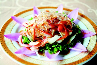 新興園購(gòu)入一斤將近3百元的蘭花蚌,將蚌肉汆燙后以冰塊冰鎮(zhèn),保持蚌肉彈性;在盤中鋪上一圈香水蓮花花瓣,淋上少許色拉,再放上切絲洋蔥做底;將蘭花蚌肉放在洋蔥上,加上少許脆藻,最后淋上特調(diào)和風(fēng)醬,一盤如蓮花盛開的料理就呈現(xiàn)在眼前。