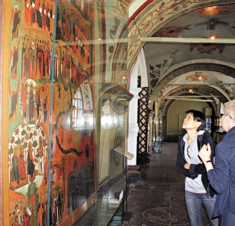 周美青在俄方人員陪同下參觀了修道院,并進入院內(nèi)的一間教堂,她對教堂內(nèi)東正教的圣像畫特別感興趣,其中一幅壁畫“末世的審判”描繪東正教里人與天地的關系,以及天堂與地獄的對比,周美青在壁畫前駐足良久仔細欣賞,似乎對東正教信仰有所體會。