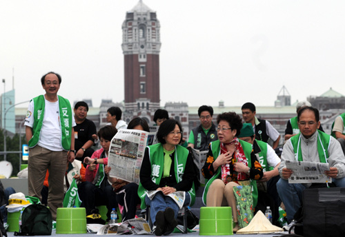 凌晨靜坐民眾逐漸散去,至上午仍在凱道群眾大約剩上千人,主舞臺區(qū)有民進黨主席蔡英文、呂秀蓮、前“行政院長”謝長廷、蘇貞昌等人。