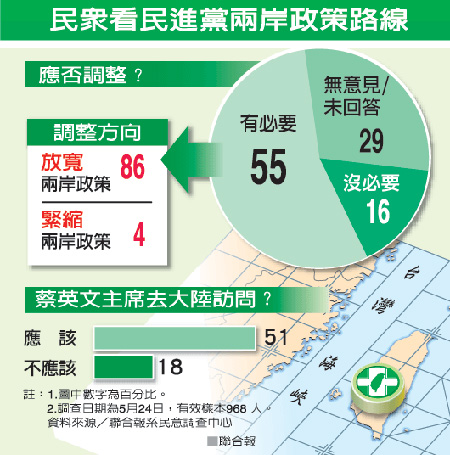 隨著陳菊訪問大陸,民進(jìn)黨的兩岸政策路線成為新的話題。調(diào)查顯示,五成五民眾認(rèn)為民進(jìn)黨有必要調(diào)整對(duì)大陸政策,一成六覺得無此必要;其中,認(rèn)為民進(jìn)黨應(yīng)調(diào)整路線者,八成六主張民進(jìn)黨放寬兩岸政策,僅百分之四覺得應(yīng)更為緊縮。