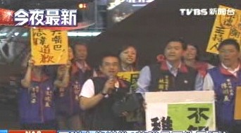 藍營議員高喊:“謝志偉道歉!民視負責!謝志偉道歉!”藍營議員算準謝志偉上班時間,帶隊到民視大門口抗議,但兩排警力層層擋住大門口,臺北縣議員陳明義,腳進不去,干脆用手丟雞蛋泄憤。