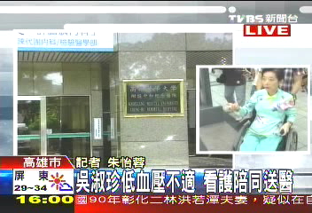 根據(jù)醫(yī)護人員初步檢查,吳淑珍疑似因為過度勞累而出現(xiàn)血壓過低的情況,住進(jìn)醫(yī)院VIP病房,將接受主治醫(yī)生進(jìn)一步的詳細(xì)檢查。