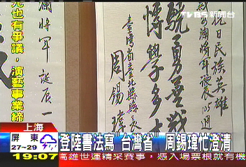 據(jù)臺(tái)媒報(bào)道,在上海的書(shū)畫(huà)展中,臺(tái)北縣長(zhǎng)周錫瑋送去的書(shū)法,上面落款寫(xiě)的是“臺(tái)灣省臺(tái)北縣長(zhǎng)周錫瑋”,“臺(tái)灣省”三個(gè)字引發(fā)島內(nèi)討論。