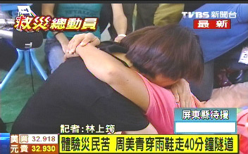周美青努力安撫每位災(zāi)民,好幾位民眾一度都忍不住放聲哭泣,和周美青相擁在一起,周美青也緊緊的抱著他們,心情也跟著難過(guò)。