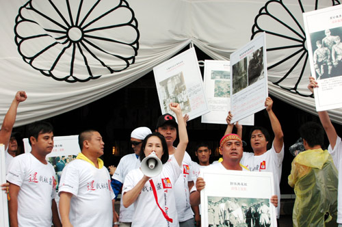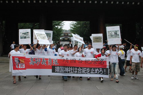 8月11日,高金素梅一行于上午9時(shí)30分左右搭車出其不意地抵達(dá)靖國神社,隨即高舉“要求靖國還我祖靈”等大型橫布條標(biāo)語,浩浩蕩蕩地列隊(duì)走向靖國神社的正殿,并高喊口號(hào)。靖國神社的警衛(wèi)人員前往阻擋,企圖奪走標(biāo)語布條,雙方發(fā)生肢體沖突。