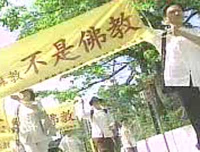 來自臺(tái)北的“正覺佛教基金會(huì)”成員在高雄巨蛋外舉著布條和標(biāo)語,高喊“(達(dá)賴?yán)?不是和平者、否定正法、死后必下地獄”等口號(hào)。