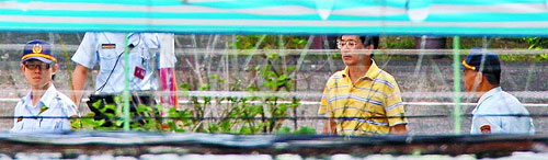 扁最近作息正常,每天放風,走出舍房曬太陽、運動。北所為保護扁安全,今年1月起在他放風的運動場外掛起帆布,但前天仍被記者直擊扁放風畫面?梢钥闯鏊袅祟^發(fā),穿著深藍色短褲、藍白拖鞋,繞著運動場慢走。
