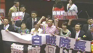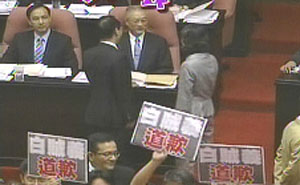 據(jù)臺灣TVBS報道,吳敦義還沒上臺,事前保密到家的民進(jìn)黨“立委”們,突然拿著白布條、標(biāo)語霸占主席臺,大喊“白賊義,道歉”,稱吳敦義香港行的說法一變再變,有誠信問題。吳敦義則留在原位,國民黨人上前安撫,也做護(hù)駕動作,避免與民進(jìn)黨“立委”發(fā)生肢體沖突。