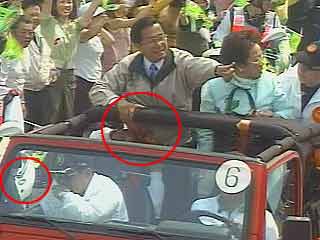 后來確認(rèn)是中槍,送到病房之前,在急診室里,呂秀蓮在旁邊掀了掀布簾要和陳水扁講話,“她說:絕對是她先中槍,然后我才中槍,而我中的那槍,是打中她的子彈反彈到我身上來的,所以我才會受傷。”陳水扁說,他告訴呂秀蓮不要隨便亂講,“我知道的不是那樣,而相關(guān)人員向我做的報(bào)告也不是如此!碑(dāng)時(shí)他穿了三層衣服,夾克、襯衫和內(nèi)衣,他的右側(cè),三層衣服都有子彈的穿入的痕跡,而靠近呂秀蓮的左側(cè),只有內(nèi)衣與襯衫有穿孔,夾克則沒有。