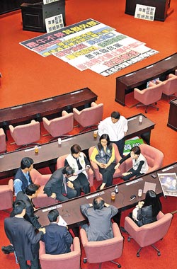 實在忍無可忍“立法院”院會陷入空轉(zhuǎn),民進黨團杯葛議事,“立委”放置好抗議美國牛肉進口的海報布條后,聚在一旁交換意見,而國民黨也未動員黨籍“立委”進場,王金平難得動怒,表示朝野可以一面協(xié)商牛肉問題,一面