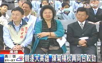 中新網(wǎng)12月14日電 據(jù)臺(tái)灣TVBS報(bào)道,樞機(jī)主教單國璽的新書發(fā)表會(huì)14日在高雄舉行,有意參選大高雄市長的現(xiàn)任縣市長陳菊跟楊秋興,一前一后到了會(huì)場,卻沒有太多互動(dòng)。對(duì)于明年誰參選,楊秋興傾向協(xié)調(diào),陳菊也很有風(fēng)度地說,兩人情誼三十年,她輸了就會(huì)幫楊秋興輔選。