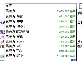 記者實(shí)際在Google上網(wǎng)搜尋,以馬英九為例,才打上“馬英”二個字,Google搜尋網(wǎng)頁上赫然自動跳出“馬英九,無能”,或是“馬英九,帶賽”等搜尋建議條件;在雅虎奇摩進(jìn)行同樣搜尋時,則有十項(xiàng)搜尋建議產(chǎn)生,但無“無能”或“帶賽”的搜尋建議。