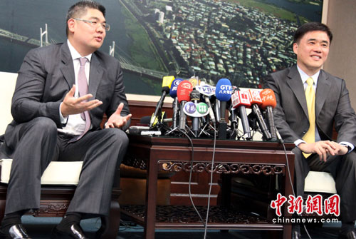 5月6日下午,中國(guó)國(guó)民黨榮譽(yù)主席連戰(zhàn)之子連勝文(左)以身體原因及階段性任務(wù)完成為由,正式請(qǐng)辭臺(tái)北悠游卡公司董事長(zhǎng),獲臺(tái)北市長(zhǎng)郝龍斌勉強(qiáng)同意。對(duì)于在悠游卡公司不足兩年的工作表現(xiàn),連勝文給自己打80分。記者會(huì)吸引大批記者,談及自己離開(kāi)該公司的不舍,連勝文一度哽咽、噙淚。中新社駐臺(tái)記者 董會(huì)峰攝