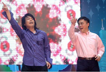 中新網(wǎng)5月19日電 據(jù)“中央社”報道,臺北市將舉辦花卉博覽會,藝人伍佰19日身披紙制環(huán)!疤諔(zhàn)警裝”化身“i花博”環(huán)保親善大使,與臺北市長郝龍斌大跳招牌花朵舞。伍佰高唱“你是我的花博”,強調(diào)愛地球、做環(huán)保,要“不眠也不休”。