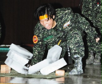 臺陸軍體干班將由女兵負(fù)責(zé)表演“刺槍擊破”,陸戰(zhàn)隊莒拳隊則由具有跆拳道五段的女兵表演破冰、破磚的猛勁。