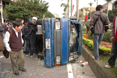 另據(jù)東森新聞報道,上午剛剛就位,正要進行采訪工作的東森新聞攝影記者王瑞璋,突然間遭一輛貨車沖撞,他當場被壓在車底下,導致左手、左腿嚴重骨折,且氣胸昏迷。據(jù)了解,不只東森記者受傷,另外還有其它電視臺和平面的攝影記者,也都遭到波及,但以王瑞璋的傷勢最為嚴重。