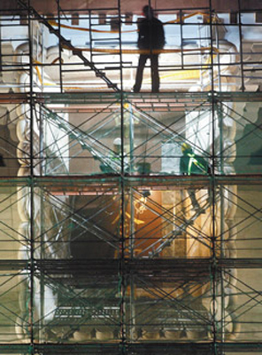 原紀(jì)念堂主建筑的牌匾,長近四米,寬二點(diǎn)四米,由十五塊花崗巖板組成,中間五塊巖板陰刻“中正紀(jì)念堂”五字。昨天下午開始拆卸,到了夜間仍施工,已經(jīng)拆除牌匾右邊的幾塊。預(yù)定今天繼續(xù)拆,拆完就可掛新牌匾,舊牌匾存放在紀(jì)念堂內(nèi)的文史館。