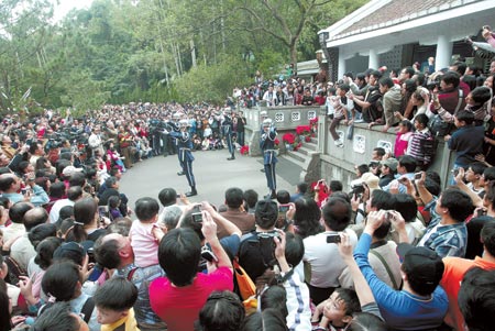 據(jù)臺灣《聯(lián)合報》報道,臺軍方宣布兩蔣陵寢今天起暫停對外開放,儀隊已于二十三日撤哨,駐守慈湖三十二年的“憲兵”也于晚間撤離。一早即吸引各地民眾涌入慈湖、頭寮兩處陵寢,有人表達懷念,有的來看熱鬧,慈湖每整點的儀隊交接更是擠爆陵寢區(qū),警方估算當天共有七萬多人涌進大溪。