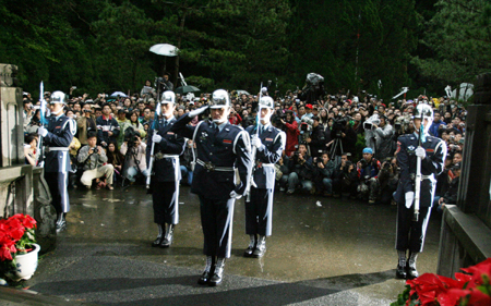 中新網(wǎng)12月24日電 昨天下午五時,臺灣慈湖大溪陵寢進行最后一班儀隊交接,儀隊“憲兵”高喊“敬禮”后撤哨,慈湖和頭寮兩蔣陵寢隨之關(guān)閉。目睹歷史的一刻,有民眾哽咽落淚。