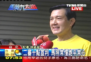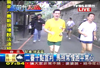 據(jù)臺灣TVBS報(bào)道,馬英九穿著一件黃色輕便的運(yùn)動(dòng)服,同往常一樣在六點(diǎn)四十分就從家門出發(fā)要去慢跑。記者問他對二審的判決有沒有信心,馬英九說,慢跑的時(shí)候他暫時(shí)不想回答這個(gè)問題。