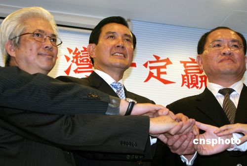 馬英九(中)與其辯護(hù)律師將手緊緊搭在一起。中新社發(fā) 董會峰 攝